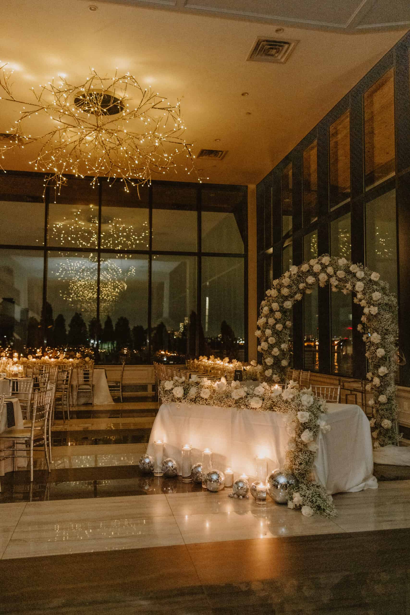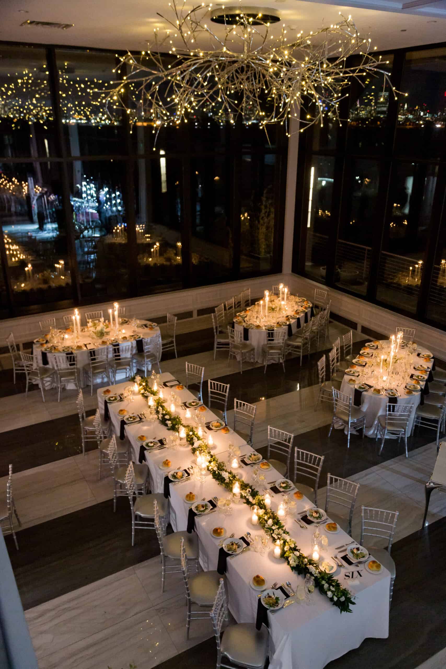 Floor-to-ceiling windows ensure the remarkable views of Manhattan’s skyline remain unobstructed. Cathedral ceilings and chandeliers that mimic twinkling lights of the city skyline are sure to leave you in awe.
