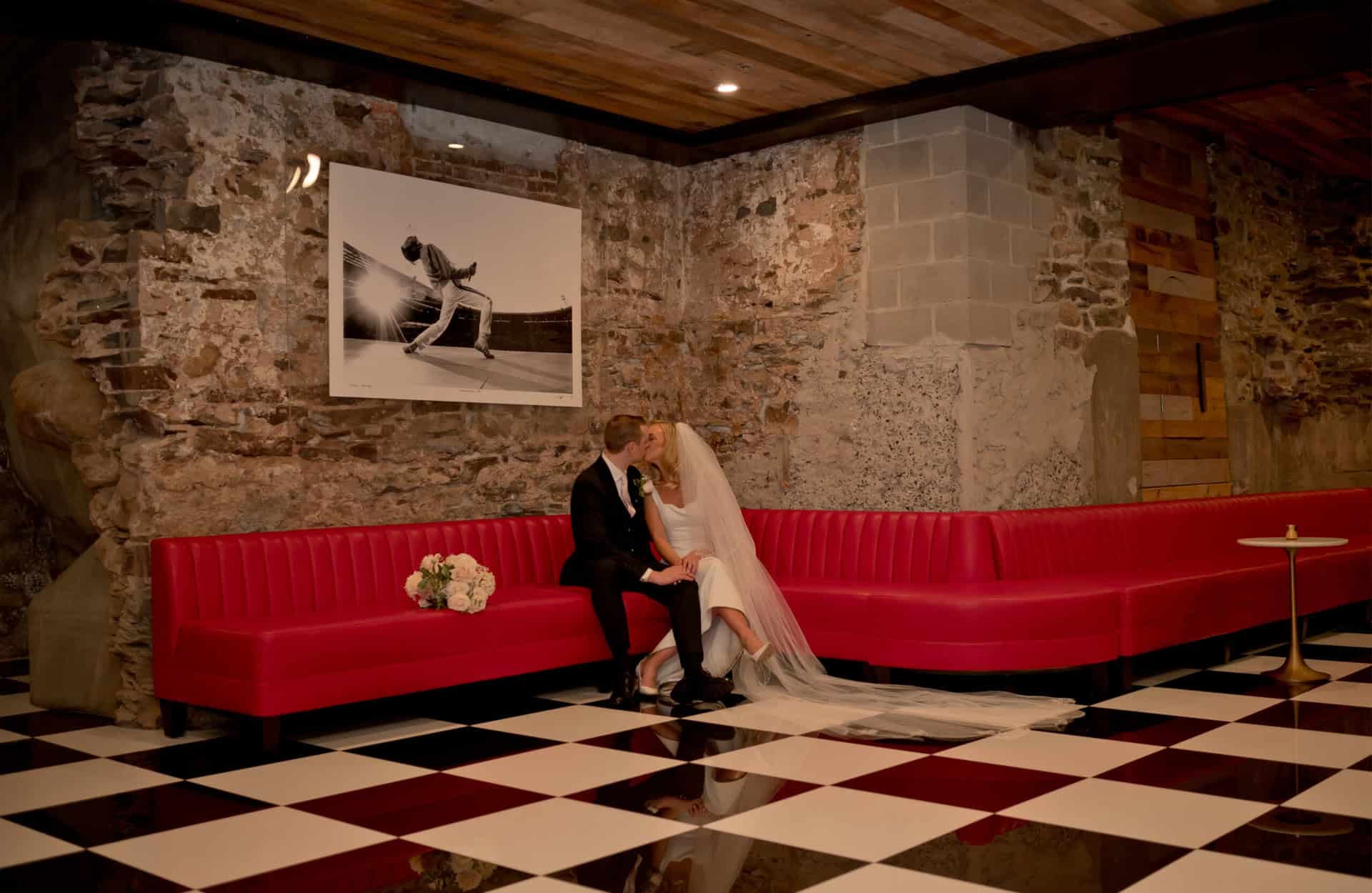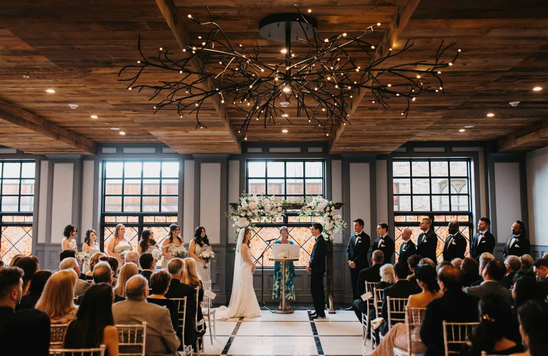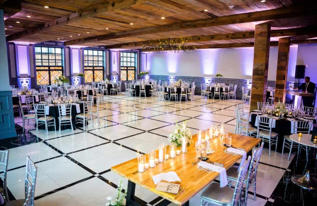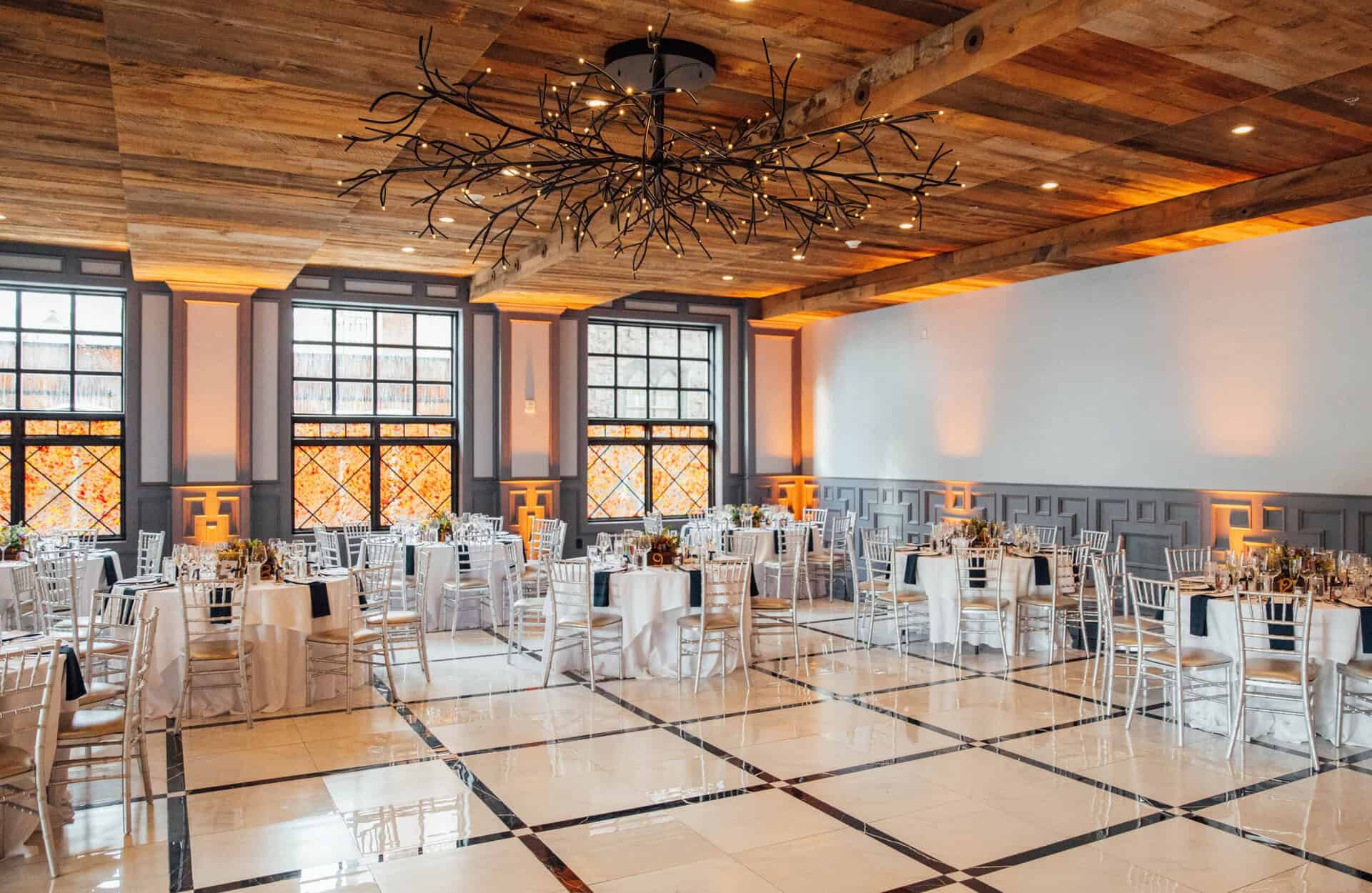 With reclaimed wood ceilings, a sparkling chandelier, striking art, and stone floors, the Riverstone Ballroom, paired with a cocktail space and whiskey lounge, offers a bold and memorable atmosphere for weddings up to 150 guests.